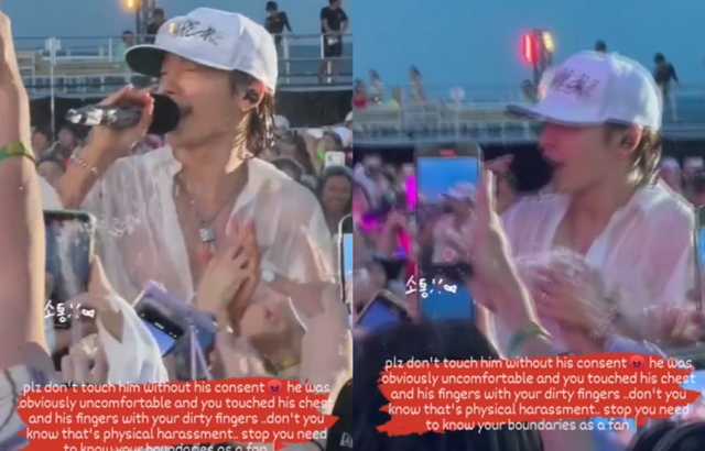 从粉丝拍下的影片中,可以看到在东海走下舞台和大家互动时,有一名粉丝趁着超近距离摸上东海已经湿透的胸膛,虽然当下东海已立刻用手护在胸前,试图用礼貌的方式拒绝此行为,但仍挡不住该名疯狂粉丝的魔手,最后甚至还被强制十指紧扣⋯是他紧急转身面对另外一边的粉丝,才结束这场骚扰!
