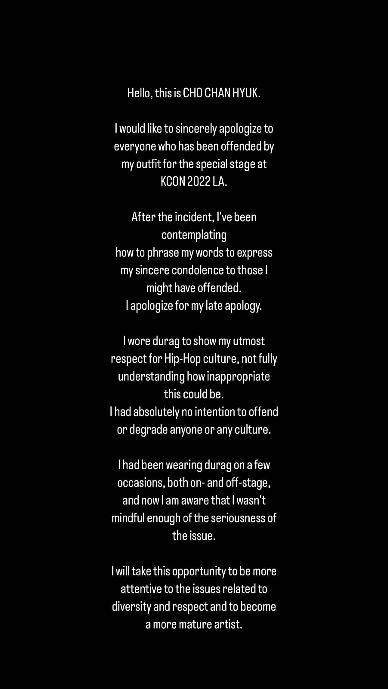 8 月 3 日,Chan 在 Instagram Stories 上用英语和韩语道歉,因为去年 8 月举行的 KCON 2022 LA 上 TO1 的表演中佩戴了杜拉格。