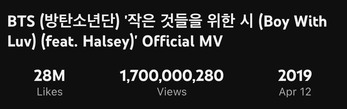 8 月 21 日晚上 8:19 左右BTS 防弹少年团 KST 的 2019 年热门歌曲《Boy With Luv》(与 Halsey 合作)的音乐视频在 YouTube 上的观看次数突破了 17 亿次!这标志着该团体继《Dynamite》之后第二个实现这一目标的音乐视频,也是第二个实现这一壮举的韩国男孩组合音乐视频。