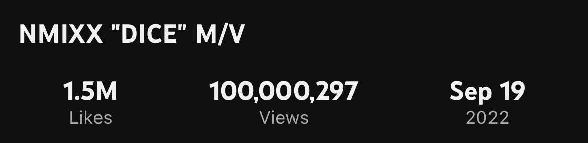 8 月 24 日晚上 8:27 左右KST、NMIXX的《DICE》音乐录影带观看次数突破1亿次,这是他们继出道MV《O.O.》之后第二个突破1亿次的音乐录影带。
