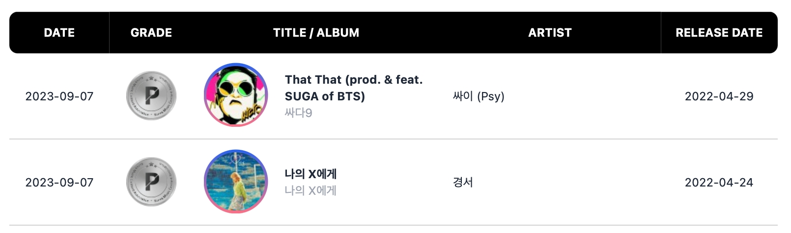 与此同时,PSY 的《That That》(由 BTS 的 Suga 制作并担任主唱)和 KyoungSeo 的《Dear my X》均获得了白金认证,播放量均达到 1 亿次。