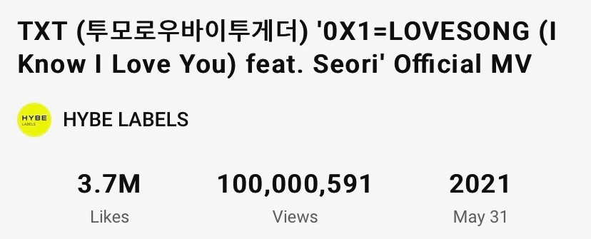 TXT最初于2021年5月31日下午6点发布了“0X1=LOVESONG(我知道我爱你)”的音乐视频。 KST,这意味着该视频仅用了 2 年零 3 个月零 16 天就达到了这一里程碑。