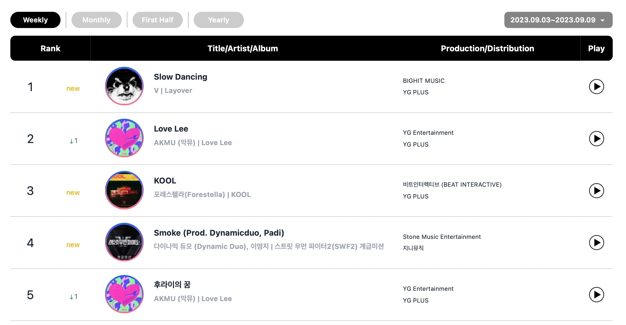 Forestella 的新歌《KOOL》在本周排行榜上首次亮相,排名第 3 位,而 Dynamic Duo 和 Lee Young Ji 的《Smoke》(来自 Mnet 的《街头女战士 2》)则进入排行榜第 4 位。