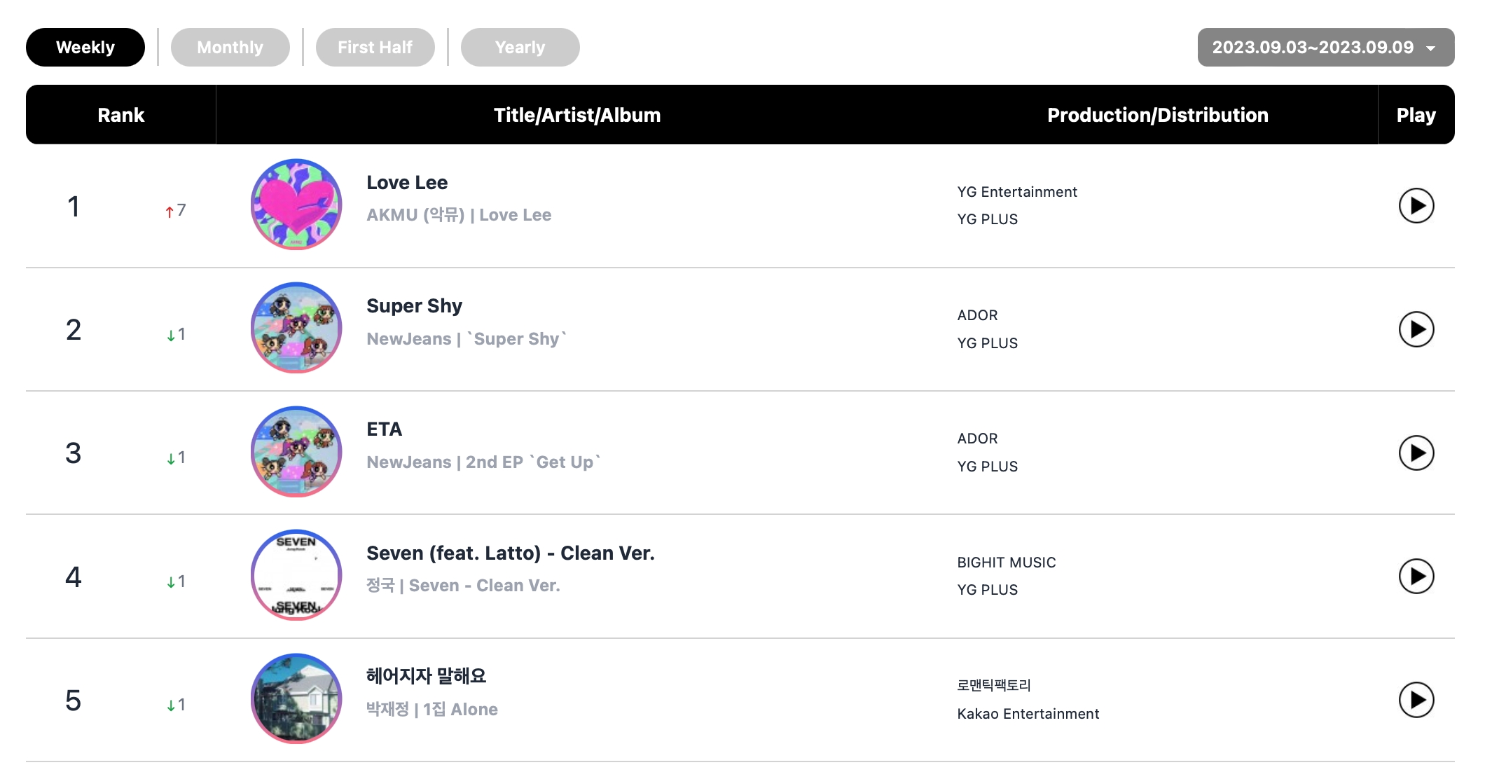 同样的五首歌曲在本周的流媒体排行榜上名列前茅,尽管顺序不同:AKMU 的“Love Lee”排名第一,其次是 NewJeans 的“Super Shy”和“ETA”,分别排名第二和第三。 Jungkook 的《Seven》排名第四,Parc Jae Jung 的《Let’s Say Goodbye》排名第五。