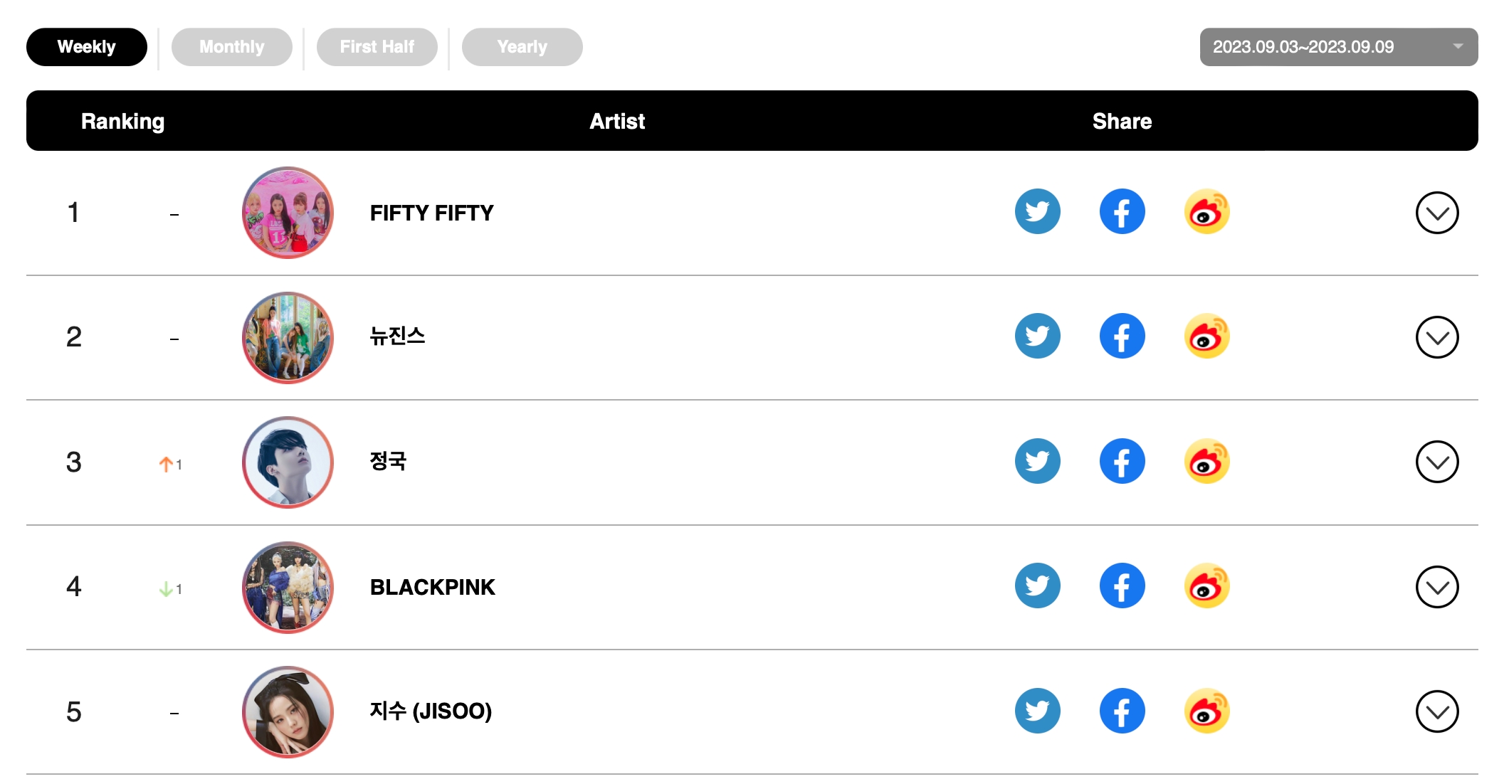 FIFTY FIFTY 在本周的社交排行榜上捍卫了第一名的位置,而 NewJeans 则保持了第二名的位置。