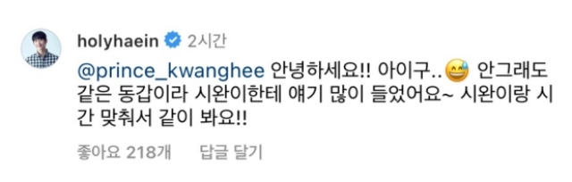 接着丁海寅也回应光熙「您好!!唉一估…因为我们都同龄,所以常常在时完那边听到您的事情~找时间跟时完都一起出来见面吧!!!」超温暖互动引发大赞,不少网友都称赞两人真的太善良~