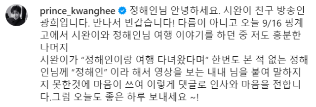 17日,光熙现身丁海寅个人 IG 留言「丁海寅先生您好,我是时完的朋友综艺人光熙,很高兴见到您!不是因为其它的,是我今天9/16在《只是藉口》说到时完跟丁海寅nim旅行的事情太兴奋,直接说时完『跟丁海寅一起去旅行了』,对一次都没见过的丁海寅nim直接说出了『丁海寅』,所以在看节目时一直想说应该要加nim的,让我感到很不舒服,所以才这样用留言来跟您打招唿,并转达我的心意。那么希望您今天也有美好的一天~!」
