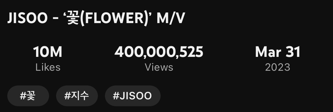 10 月 3 日下午 3:57 左右Jisoo 的个人出道歌曲《FLOWER》的音乐视频 KST 在 YouTube 上的观看次数突破了 4 亿次。
