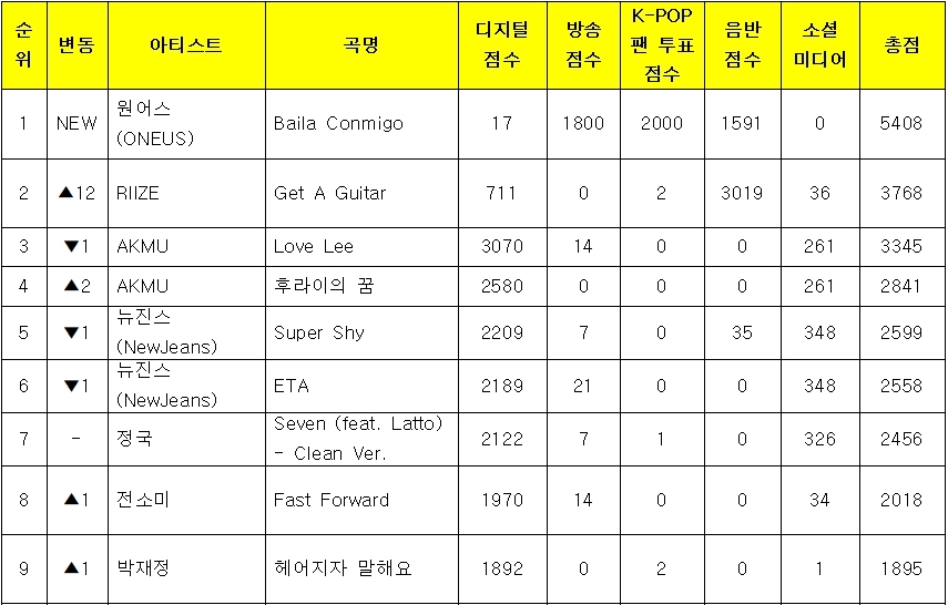 虽然 10 月 6 日的《音乐银行》由于亚运会现场报道而没有播出,但据宣布,本周第一名的候选者是 ONEUS 的《Baila Conmigo》和 RIIZE 的《Get A Guitar》。最终,ONEUS成为胜利者!