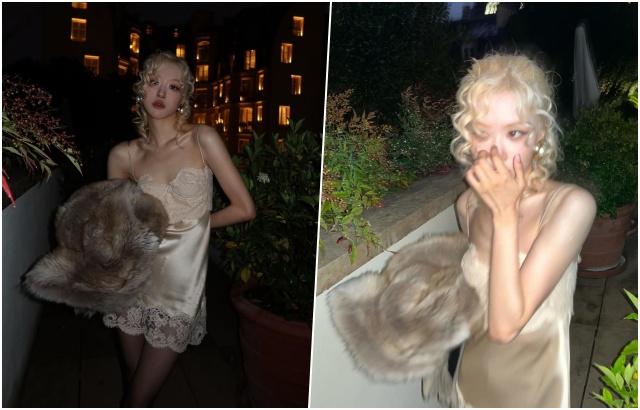 过往几乎都是以黑色礼服亮相的Rosé,这次则是穿上蕾丝有光泽感丝缎的肤色小洋装,外面则是套上棕色的皮草大衣,下半身穿上黑丝袜,整个人辣度破表。招牌金髮这次也用成泡面捲捲头,整体造型都再度凸显她令人羡慕的美貌。